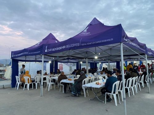 İzmir Büyükşehir Belediyesi Ramazan'ın ilk günü Konak Atatürk Meydanı'nda depremden sonra kente gelen 5 bin depremzedeye iftar verildi. İftara İzmir Büyükşehir Belediye Başkan Vekili Mustafa Özuslu, CHP İzmir Milletvekilleri Kani Beko ve Tacettin Bayır, Kemalpaşa Belediye Başkanı Rıdvan Karakayalı ile eşi Lütfiye Karakayalı, İYİ Parti İzmir İl Başkanı Sinan Bezircioğlu, İzmir Büyükşehir Belediyesi Genel Sekreteri Barış Karcı, İzmir Büyükşehir Belediyesi Genel Sekreter Yardımcısı Ertuğrul Tugay, İzmir Kent Konseyi Başkanı Nilay Kökkılınç bürokratlar, sivil toplum kuruluşlarının başkanları ile temsilcileri ve depremzede vatandaşlar katıldı.
