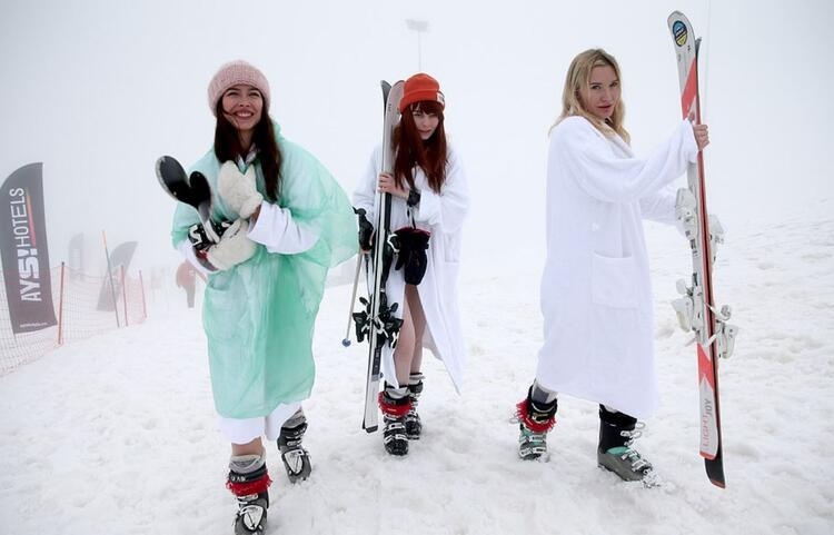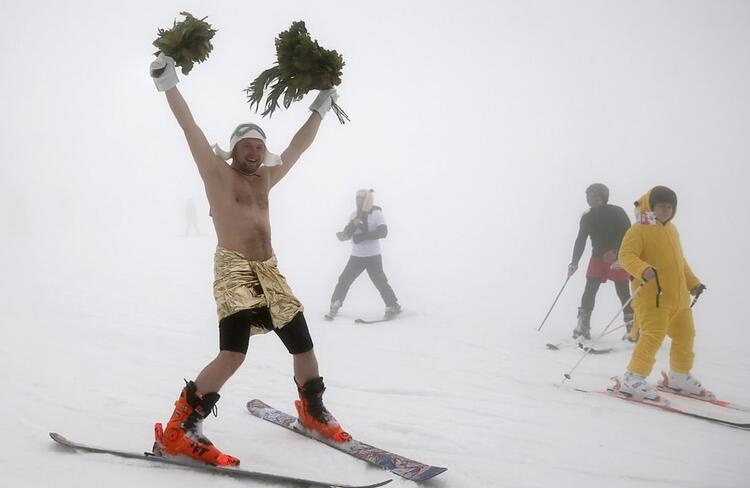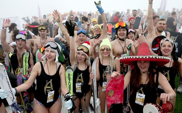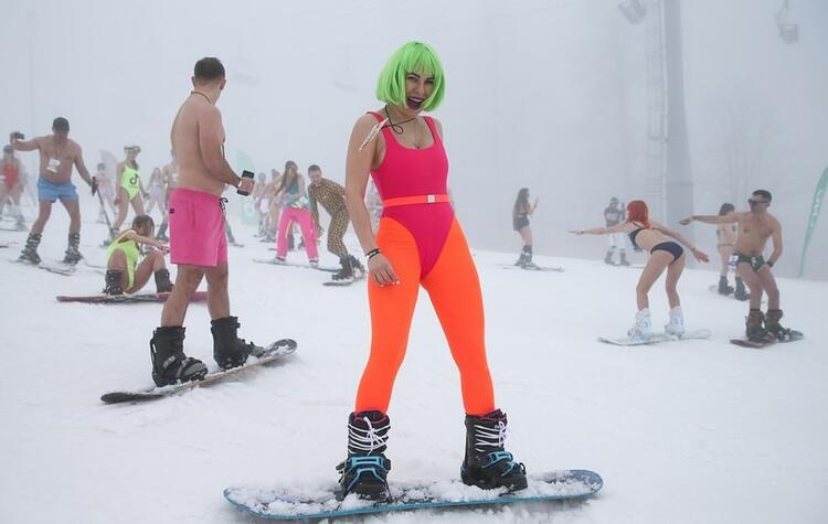 Eğlence meraklılarının çoğu dünyaya diz çöktüren koronavirüs salgınına aldırmadan mayo, şort ve bikinilerle yamaçlara çıkarken maske takmamayı tercih etti. Bu tür festivaller, kış sezonunun sonunu vurgulamak adına, Rusya'nın gelişmekte olan kayak merkezlerinde popüler hale geldi.