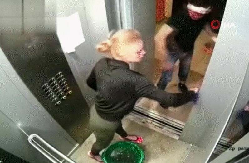 Kadın, erkek arkadaşına karşı koymaya çalışırken, asansördeki şiddet dakikalarca devam ediyor. Adam telefonda görüşme yaptığı sırada kadın asansörde kamera olduğunu fark ediyor.Öfkeli adam kamerayı umursamazken, saniyeler sonra acımasızca vurmaya devam ettiği ve kafa attığı kadını asansörden dışarı atıyor. Kavgayı sona erdiren genç çiftin kanlar içinde kalan asansörü temizlik kovası ve bez alarak temizlemeye geldiği görülüyor.