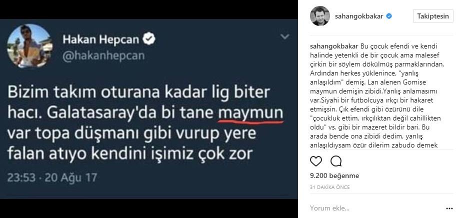 ''Bu çocuk efendi ve kendi halinde yetenkli de bir çocuk ama malesef çirkin bir söylem dökülmüş parmaklarından. Ardından herkes yüklenince, "yanlış anlaşıldım" demiş. Lan alenen Gomise maymun demişsin zibidi. Yanlış anlaması mı var! Siyahi bir futbolcuya ırkçı bir hakaret etmişsin. Çık efendi gibi özürünü dile "çocukluk ettim, ırkçılıktan değil cahillikten oldu" vs. gibi bir mazeret bildir bari. Bu arada ben de ona zibidi dedim, yanlış anlaşıldıysam özür dilerim zabudo demek istemiştim..."