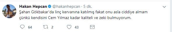 Gökbakar'ın paylaşımını gören Hakan Hepcan'dan ise yanıt gecikmedi. Hepcan Twitter hesabı üzerinden şunları yazdı: "Şahan Gökbakar'da linç kervanına katılmış fakat onu asla ciddiye almam çünkü kendisini Cem Yılmaz kadar kaliteli ve zeki bulmuyorum."