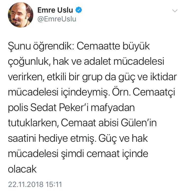 ‘’Şunu öğrendik: Cemaatte büyük çoğunluk, hak ve adalet mücadelesi verirken, etkili bir grup da güç ve iktidar mücadelesi içindeymiş. Örn. Cemaatçi polis Sedat Peker’i mafyadan tutuklarken, Cemaat abisi Gülen’in saatini hediye etmiş. Güç ve hak mücadelesi şimdi cemaat içinde olacak’’