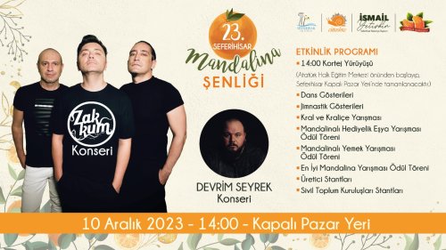 Şenlik, birbirinden eğlenceli etkinliklerin yanı sıra çeşitli dans gösterileri ve yarışmalara sahne olacak. Şenlikte eğlenceli etkinliklerin yanı sıra narenciye üretiminin dünü, bugünü ve yarını tartışılacak. Ünlü müzik grubu Zakkum ve Devrim Seyrek konseri ile şenlik renklenecek. 23. Mandalina Şenliği, 10 Aralık Pazar günü Seferihisar Kapalı Pazar Yeri’nde saat 14.00'te başlayacak.