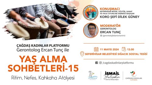 Belediyenin, Çağdaş Kadınlar Platformu ve Cittaslow iş birliğinde bu hafta 15.'sini düzenleyeceği etkinlikte, 'Ritim, Nefes ve Kahkaha Atölyesi' düzenlenecek. Moderatörlüğünü Gerontolog Ercan Tunç'un yaptığı Yaş Alma Sohbetleri'nde, Seferihisar Müzik, Kültür, Sanat ve Halk Oyunları Derneği Başkanı, Koro Şefi Dilek Günay konuşmacı olarak yer alacak.