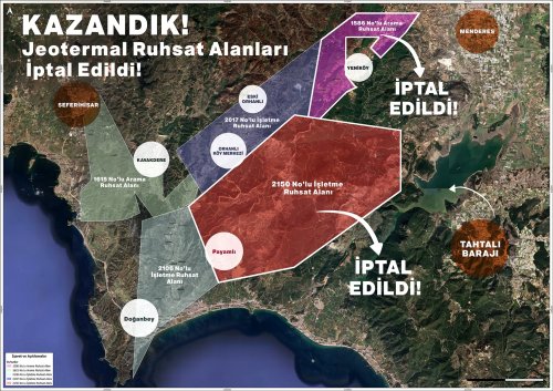 İptal edilen 1586 sayılı jeotermal kaynak arama ruhsat alanı ve 2150 sayılı jeotermal kaynaklar ve doğal mineralli sular işletme ruhsat alanı İzmir’in nefes almasını sağlayan ormanlarını ve gıdasını sağlayan havzalar için büyük tehdit oluşturuyordu.