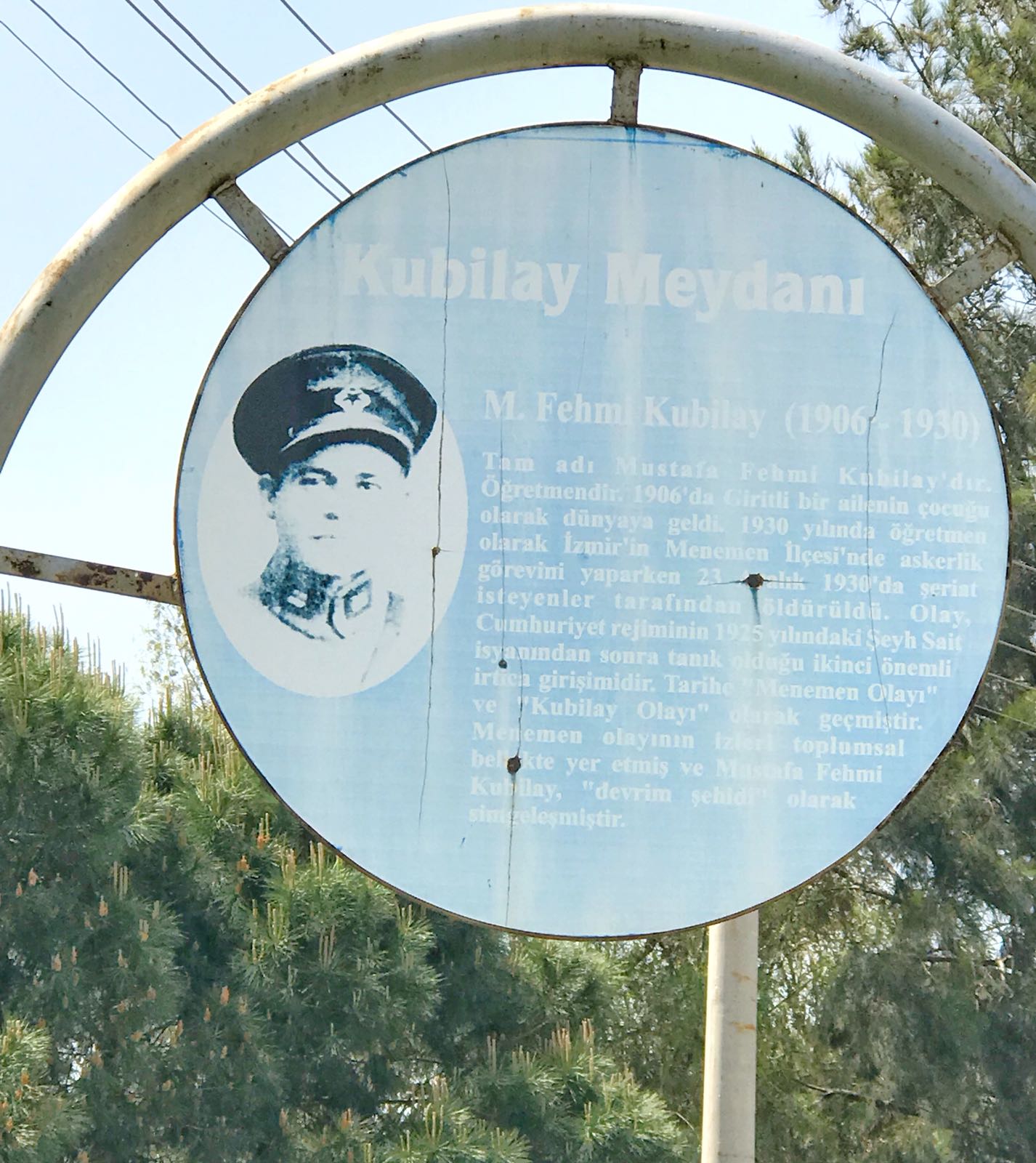 88 yıl önce İzmir Menemen'de Cumhuriyet karşıtları tarafından şehit edilen Asteğmen Mustafa Fehmi Kubilay'ın adının verildiği Güzelbahçe'deki meydandaki tabela, kaderine terk edildi.