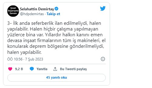 Demirtaş Twitter'dan yaptığı açıklamada, "İlk anda seferberlik ilan edilmeliydi, halen yapılabilir. Halen hiçbir çalışma yapılmayan yüzlerce bina var. Yıllardır halkın kanını emen devasa inşaat firmalarının tüm iş makineleri, el konularak deprem bölgesine gönderilmeliydi, halen yapılabilir." dedi.