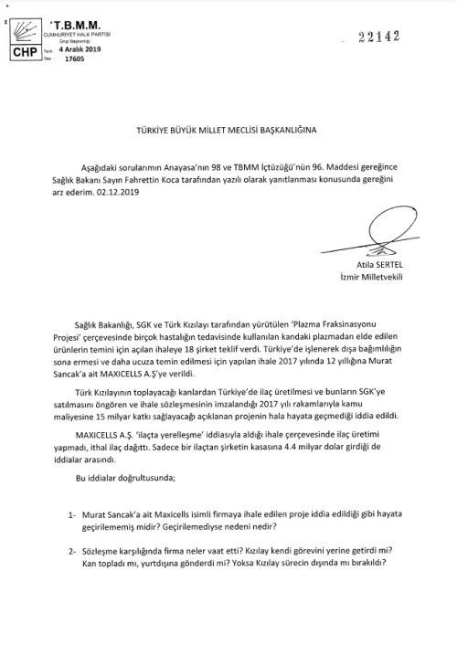 İlk soru önergesini 4 aralık 2019 yılında verdiğini hatırlatan Sertel, "SGK ve Türk Kızılayı tarafından yürütülen Plazma Fraksiyonu Projesi kapsamında ihaleyi alan şirketin yükümlülüklerini yerine getirip getirmediğine ve firmaya verilen alım güvencesine ilişkin bir soru önergesiydi bu. Bu ihale 2017 yılında Murat Sancak’a ait Maxicells A.Ş. isimli şirkete verilmişti. Bu projenin hayata geçirilip geçirilmediğini sormuştum. Bu soru önergem yanıtsız kaldı. Yine Elazığ-Malatya depreminin ardından Ensar Vakfı’na 8 milyon dolar bağışladığı ortaya çıkan Kızılay’a bu paranın hesabını sormuştum. Bu bağışı Başkentgaz’ın kendisine aktararak yaptığını ve vergi kaçırmanın mübah olduğunu söylemişti Kızılay yönetimi." ifadelerini kullandı.