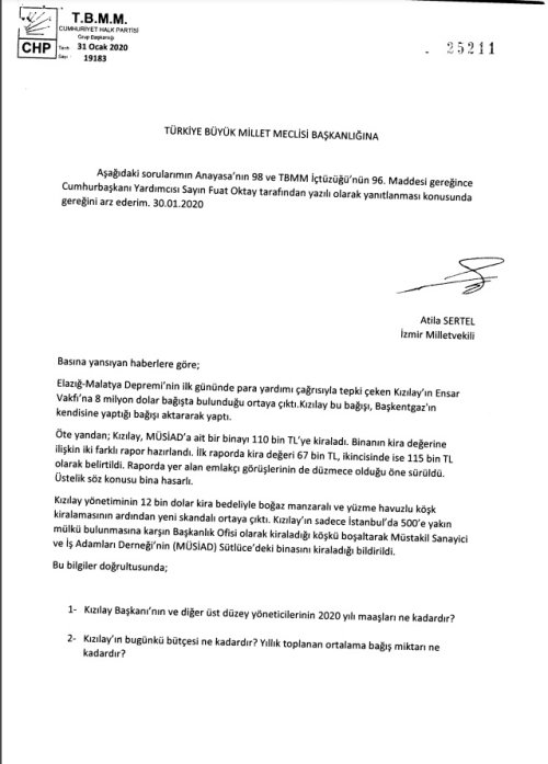 Deprem sonrası ortaya çıkan tartışmaların ardından Kızılay’ın kan ve trombosit satışına ilişkin iddiaları ve Kızılay’a bağışlanan gayrimenkullerin akıbetini de sorduğunu belirten Sertel, yasal süresi içinde bu soruların cevaplanmasını beklediğini ifade etti.