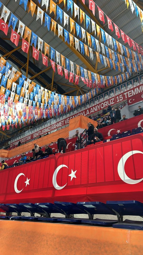 Halkapınar Spor Salonunda hazırlıklarını tamamlayan partililer, astıkları afişlerle de dikkat çekiyor.