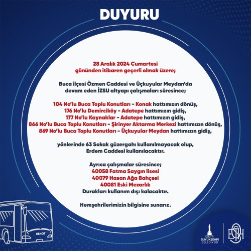 MEDYA EGE - İzmir Büyükşehir Belediyesi ESHOT Genel Müdürlüğü'nün sosyal medya hesabı üzerinden vatandaşlara önemli bir duyuru yapıldı. Yapılan duyuruya göre; Buca ilçesi Özmen Caddesi ve Üçkuyular Meydan'da devam eden İZSU altyapı çalışmaları süresince, bazı otobüs hatlarında güzergah değişikliği yapılacak. Ayrıca çalışmalar tamamlanıncaya kadar bazı duraklar kullanım dışı kalacak.