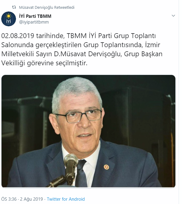 "02.08.2019 tarihinde, TBMM İYİ Parti Grup Toplantı Salonunda gerçekleştirilen Grup Toplantısında, İzmir Milletvekili Sayın Musavat Dervişoğlu, Grup Başkan Vekilliği görevine seçilmistir."