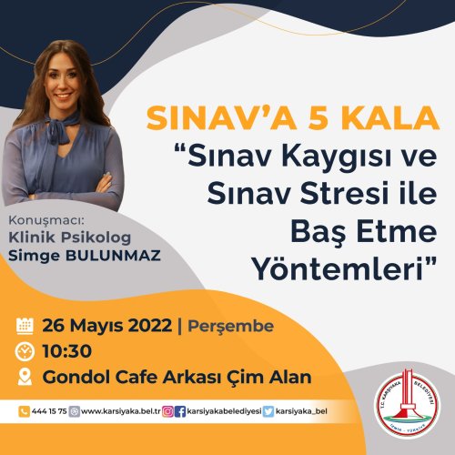 Karşıyaka Belediyesi sosyal medya hesabından etkinliğe ilişkin paylaşımda "Kadın ve Aile Hizmetleri Müdürlüğü’müzün düzenlediği Sınav’a 5 Kala “Sınav Kaygısı ve Sınav Stresi ile Baş Etme Yöntemleri” seminerinde, konuşmacı klinik psikolog Simge Bulunmaz ile birlikte çocuklarımıza sınav kaygısıyla baş ederken nasıl destek olabileceğimizi konuşacağız." ifadelerine yer verildi.