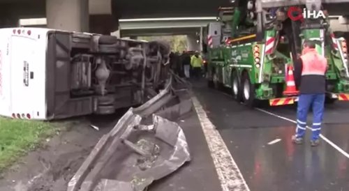 Kaza Basın Ekspres yolu Çobançeşme kavşağında meydana geldi. Bakırköy yönüne giden sivil polisleri taşıyan servis minibüsü yağmurlu havanın etkisiyle bariyere çarparak devrildi.