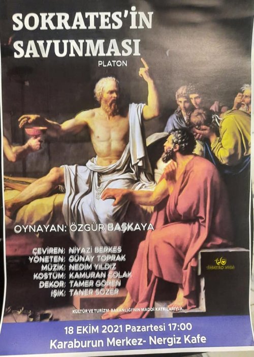 Sokrates’in ünlü savunmasını ve mahkum edilme süreçlerini anlatan oyunda, kendisine yöneltilen “gençlerin ahlakını bozmak ve dinsizlik” suçlamalarına karşı Atina vatandaşlarından oluşan yargıçlara, suçlamaların yalan ve asılsız olduğunu, sorular sorarak kanıtlamaya çalışır. Bu savunma; ‘demokrasi’, ‘adalet’ ve ‘bilgi gibi kavramların tartışıldığı tüm insanlığa yönelik büyük bir ders olmuştur. Güncelliğini de her dönem korumaktadır.