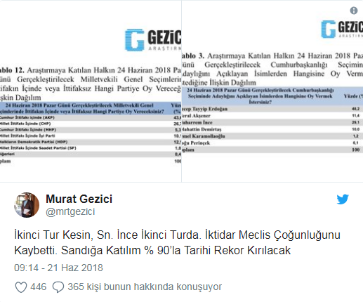 Gezici Araştırma Merkezi'nin başkanı Murat Gezici, 24 Haziran'da yapılacak olan çifte seçim için yaptığı son anketi yayınladı. Katılımın yüzde 90 ile rekor kıracağını söyleyen Gezici'ye göre iktidar Meclis'te çoğunluğu kaybediyor, ikinci tura Erdoğan ve İnce kalıyor.