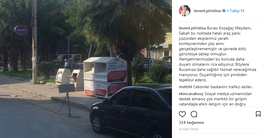 Araçların çöplerin hemen önüne park etmesi sebebiyle çöpleri toplayamayan Buca Belediyesi'nin çöp kamyonları, oradan hiç geçmemiş gibi paylaşımda bulunulması Başkan Piriştina'yı da harekete geçirdi. Sosyal Medya hesaplarından duruma ilişkin açıklamada bulunan Buca Belediye Başkanı Levent Piriştina, "Burası Kozağaç Meydanı.. Sabah bu noktada hatalı araç parkı yüzünden ekiplerimiz yeraltı konteynerinden çöp alımı gerçekleştirememiştir ve çevrede kötü görüntüye sebep olmuştur. Hemşehrilerimizden bu konuda daha duyarlı olmalarını rica ediyoruz. Böylece Bucamıza daha sağlıklı hizmet vereceğimize inanıyoruz. Duyarlılığınız için şimdiden teşekkür ederiz" açıklamasında bulundu.