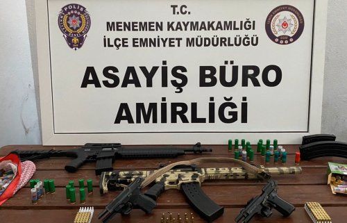 Menemen İlçe Emniyet Müdürlüğü Asayiş Büro Amirliği ekipleri, ruhsatsız tabanca ve aranan şahısların yakalanmasına yönelik bir eve operasyon gerçekleştirdi. F.K. (24) ve E.K.'ye (30) ait evde yapılan aramada, çok sayıda ruhsatsız tabanca ve tüfek ile silahlara ait mermi ve kartuş ele geçirildi.