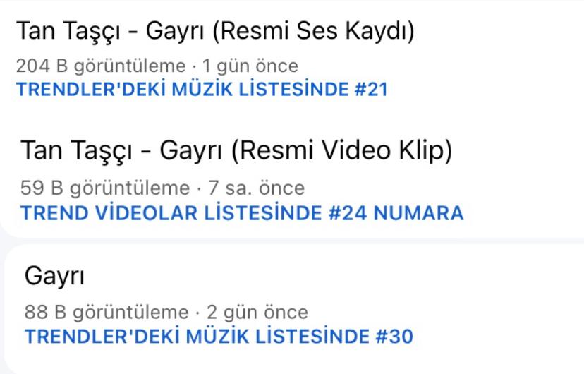 Tan Taşçı’nın yeni teklisi “Gayrı”nın 3 ayrı içeriği Youtube’da eş zamanlı olarak Trend’deki Müzik ve Video listelerinde yerini aldı. Taşçı, Türkiye’de ilk kez gerçekleşen bu sıralama başarısını yakalayan ilk sanatçı oldu. Şarkı Trend'lerde yükselişine devam ediyor. 12 Mayıs’ta Harbiye ‘de yeni turnesinin açılışını ilk kez “Gayrı” ile yapacak olan Tan Taşçı, yeni şarkılarını yaz boyunca yayınlamaya devam edecek.