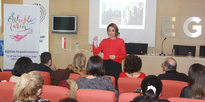 Sihirli Tarih Eğitim Organizasyonu, TARKEM ve Müzakereci Arabulucular Derneği işbirliği ile düzenlenen Sıradışı Tarih ve Kültür Etkinliği çok sayıda tarih öğretmeni, rehber ve tarih meraklısının katılımıyla Ege Genç İş Adamları Derneği (EGİAD) toplantı salonunda gerçekleştirildi. Tarihçi-Yazar ve Yaratıcı Drama Lideri Pınar Sözer Tonga, seminerde öğrencilerde müze bilinci oluşturmanın ve tarih dersini sevdirmenin yollarını anlattı. Tarih öğretmenleri tarafından ilgiyle izlenen seminerde Tonga, örnek uygulamalar öğretmenlerin öğrencileriyle yapabilecekleri etkinlikler hakkında bilgiler verdi. TARKEM Genel Müdürü Sergenç İneler ise, Kemeraltı'nda bulunan tarihi yapılar ve TARKEM tarafından restore edilerek yeniden kullanıma sunulacak yapılar hakkında bilgiler verdi. Müzakereci Arabulucu-Felsefe Öğretmeni İlknur Sarı da, müzakere ve arabuluculuk teknikleriyle okullarda şiddetin nasıl dönüştürülebileceğini örnek uygulamalarla anlattı. Seminere başta tarih öğretmenleri olmak üzere sosyal bilimler, ilkokul, rehberlik öğretmenleri, vakıf, dernek ve kamu kurumlarında çocuklarla kültürel konularda çalışma yapanların, kent kültürü ve tarihine ilgi duyanların, hoşgörü kenti İzmir’de fikir çatışmalarında uzlaşmayı yakalamak isteyenleri katıldığını söyleyen Tarihçi-Yazar Pınar Sözer Tonga, “Kentimizi, kültürel kimliğimizi koruyarak geleceğe taşıyabiliriz” dedi.