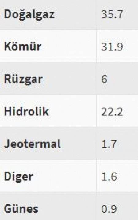 % 20 Doğalgazın payı düşerken ithal kömürle elektrik üretiminde önemli bir artış yaşandı. İthal kömürün elektrik üretimindeki payı, yüzde 22’ye kadar çıktı. Yerli kömürün (linyit) payı da yüzde 16 düzeyinde gerçekleşti. Hafta başında barajlardan elektrik üretimi yüzde 20, akarsu tipi santralardan üretim yüzde 11 olarak kayıtlara geçti. Enerji ve Tabii Kaynaklar Bakanı Berat Albayrak, sık sık yerli kaynaklar başta olmak üzere alternatifleri devreye sokarak ithal kaynak doğalgazın elektrik üretimindeki payını azaltma stratejisine vurgu yapmıştı.