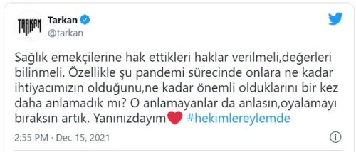 Sosyal medya hesabından paylaşım yapan Tarkan, ''Sağlık emekçilerine hak ettikleri haklar verilmeli, değerleri bilinmeli. Özellikle şu pandemi sürecinde onlara ne kadar ihtiyacımızın olduğunu, ne kadar önemli olduklarını bir kez daha anlamadık mı? O anlamayanlar da anlasın, oyalamayı bıraksın artık. Yanınızdayım'' ifadelerini kullandı.