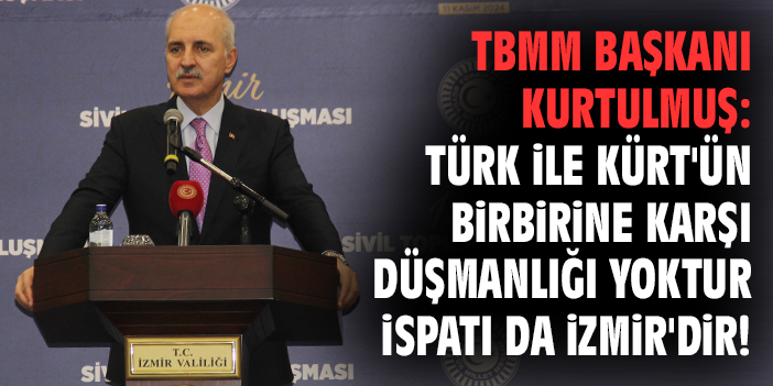 İzmir’de sivil toplum buluşmasında konuşan TBMM Başkanı Numan Kurtulmuş, “Türk’ün Kürt’ün birbirine karşı en ufak düşmanlığı yoktur, bunun ispatı da İzmir şehrinin kendisidir” dedi.