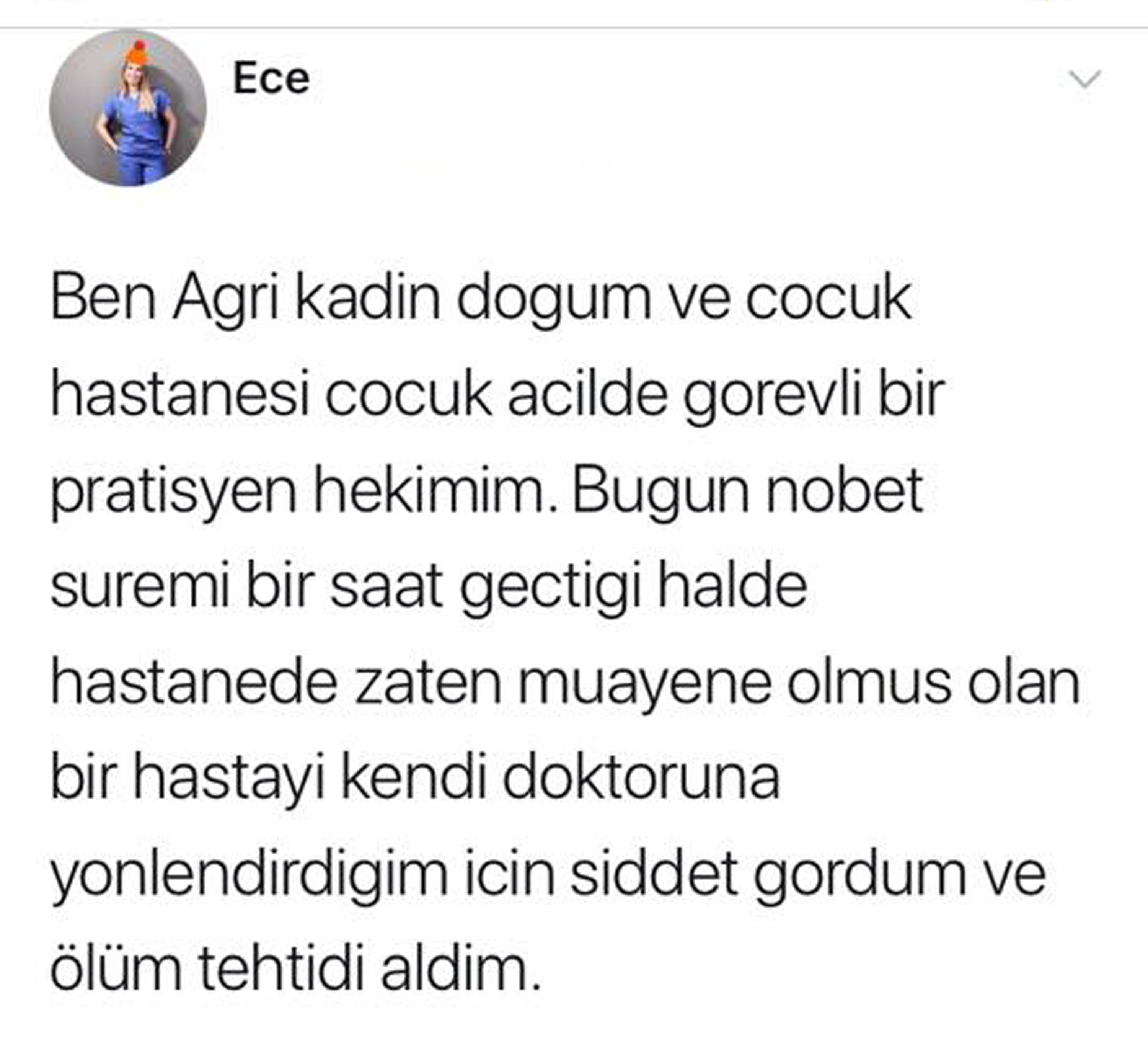 Ağrı Kadın Doğum ve Çocuk Hastalıkları Hastanesinde acil serviste görevli Dr. Ece Gökyayla, şiddete uğradı ve ölümle tehdit edildi.