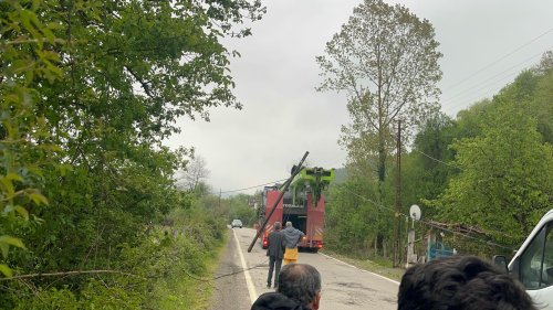 Bartın'da fore kazık makinesi taşıyan tır, yol kenarındaki tellere takıldı. Kopan teller nedeniyle internet giderken, kapanan yol nedeniyle trafik felç oldu.