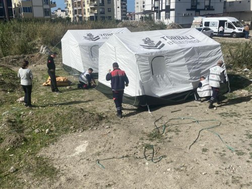 Öte yandan kurulumu yapılan çadırlarla ilgili bilgi veren Torbalı Belediye Başkanı Mithat Tekin, “10 İlimizi vuran deprem sonrasında ilk günden itibaren personelimiz ve iş makinelerimizle deprem bölgesinde çalışmaya devam ediyoruz. Kıymetli bağışçılarımız ve belediyemiz imkanlarıyla alınan termal çadırlarımız, Osmaniye'de ekiplerimiz tarafından kurulup, vatandaşlarımıza teslim edilmeye başladı. Diğer ihtiyaçları için de ekiplerimiz seferber. Yaraları beraber saracağız” ifadelerini kullandı.
