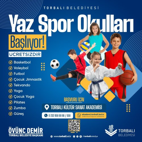MEDYA EGE – Torbalı Belediyesi, Basketbol, voleybol, futbol, tekvando gibi birçok branşta verilecek ücretsiz Yaz Spor Okulları için başvuruları almaya başladı. Adaylar Torbalı Kültür Sanat Akademisi’ne giderek veya akademi.torbali.bel.tr adresi üzerinden ya da 0232 856 66 66 ile iletişime geçerek başvuruda bulunabilecek.