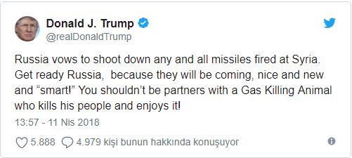Trump mesajında şu ifadelere yer verdi: "Rusya, Suriye'yi hedef alacak füzeleri vuracağını söylüyor. Hazır ol Rusya, çünkü füzelerimiz geliyor. İnsanları gazla öldüren bir hayvanla ortak olmamalıydınız."