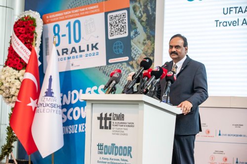 Dünya Seyahat Acentaları Birlikleri Federasyonu (UFTAA) Başkanı Sunil Kumar Rumalla, “Merhaba İzmir” diyerek konuşmasına başladı. Rumalla, “Bugün çok önemli bir gün İzmir'de. Bunlar çok büyük fuarlar, tebrik ederim. Pandemi sonrasında turizm geri döndü. İzmir çok güzel bir şehir, çok çok etkilendik. İzmir Büyükşehir Belediye Başkanını tebrik ediyorum” diye konuştu.