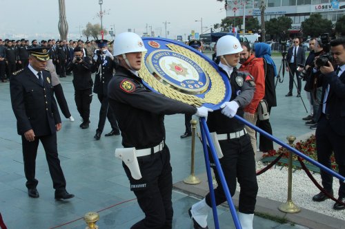Cumhuriyet Meydanı'nda yapılan törende İzmir Emniyet Müdürü Mehmet Şahne, Atatürk Anıtı'na çelenk sundu. Törene emniyet teşkilatının yanı sıra, siyasi parti temsilcileri, şehit yakınları, gaziler ve sivil toplum kuruluşu temsilcileri de katıldı. Saygı duruşunda bulunulması ve İstiklal Marşı'nın okunmasının ardından İl Emniyet Müdürü Şahne, Şeref Defteri'ni imzaladı.