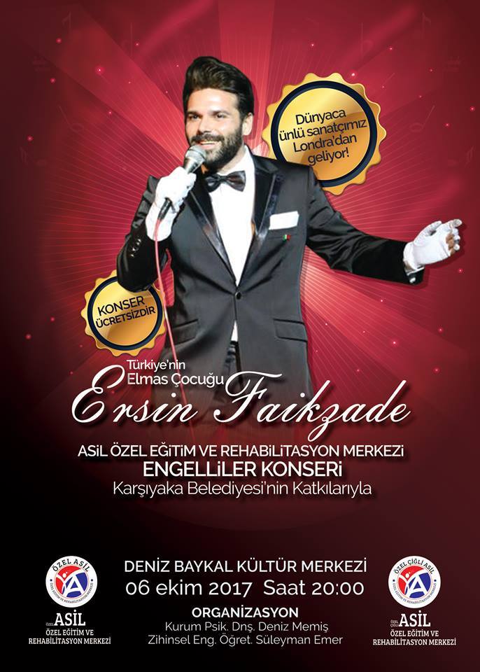 Asil Özel Eğitim ve Rehabilitasyon Merkezi'nin düzenlediği ve Karşıyaka Belediyesi'nin katkı sunduğu anlamlı etkinliğin organizatörlük görevini de Kurum Psik. Dnş. Deniz Memiş ve Zihinsel Eng. Öğretm. Süleyman Emer üstlendi. Anlamlı organizasyon 6 Ekim 2017 saat 20.00'de Karşıyaka Deniz Baykal Kültür Merkezi'nde gerçekleşecek. Ersin Faikzade'nin sahne alacağı konser ücretsiz olacak. Gecenin sunuculuğunu İzmir'in başarılı sunucularından Nil Deniz yapacak.