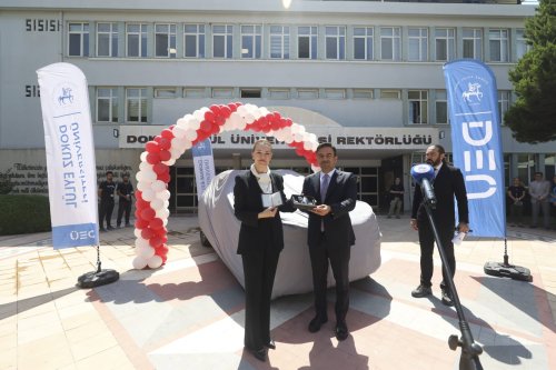 DEÜ, yerli otomobil TOGG’u düzenlenen törenle teslim aldı. TOGG’un, İzmir’deki üniversiteler arasında ilk kez DEÜ’de makam aracı olarak kullanılacağını açıklayan DEÜ Rektörü Prof. Dr. Nükhet Hotar, ilk sürüşü de kendisi yaptı.