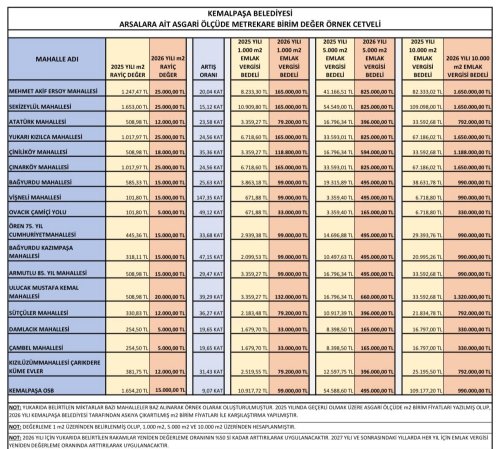Aşağıda hazırlamış olduğumuz tabloda Kemalpaşa Belediyesi rayiç bedel tespit komisyonun ortaya koymuş olduğu değerlerin tüm mahalleler olmamakla birlikte, 2025 ve 2026 yılı bazı mahallelerin karşılaştırılması yapılmış olup, rayiç bedel ve ödenecek vergi tutarı metrekareye göre hesaplanmıştır.