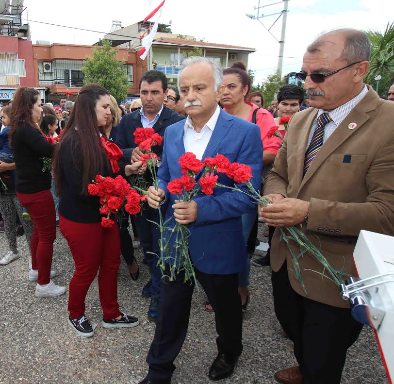 her yıl olduğu gibi bu yıl da Deniz Gezmiş, Yusuf Aslan ve Hüseyin İnan’ı Yamanlar’daki üç fidan heykelinin önünde andı. Anma törenine Bayraklı Belediye Başkanı Hasan Karabağ, eşi Bahriye Karabağ, CHP Bayraklı İlçe Başkanı Cemalettin Alper, muhtarlar, belediye meclis üyeleri ve çok sayıda vatandaş katıldı. Törende konuşan Bayraklı Belediye Başkanı Hasan Karabağ, çarpıcı mesajlar verdi. Deniz Gezmiş’in 1972’de söylediklerinin, bugün gerçekleştiğini vurgulayan Başkan Karabağ, “Deniz Gezmiş, idam sandalyesine çıktığında yaşasın ‘Tam bağımsız Türkiye’ ve ‘Yaşasın Kürt ve Türk halklarının kardeşliği’ demiş. Bin yıldır beraber yaşayan Türk halkıyla Kürt halkını asla ayırmamış. Tam bağımsızlık bugün Türkiye’de ne durumda? Yerle bir. 600 milyar dolar dış borcu olan ve sürekli ABD’den ve onun iş birlikçilerinden talimat alarak yönetilen bir Türkiye’yiz. Yaşasın tam bağımsız Türkiye deme zamanı şimdi değil mi aslında? Onun için bizim yapmamız gereken içimizden sayısı ne olursa olun Deniz, Yusuf, Hüseyin gibi düşünen, onları kurtarmak için canın veren Mahir gibi düşünen arkadaşlar lazım” dedi.