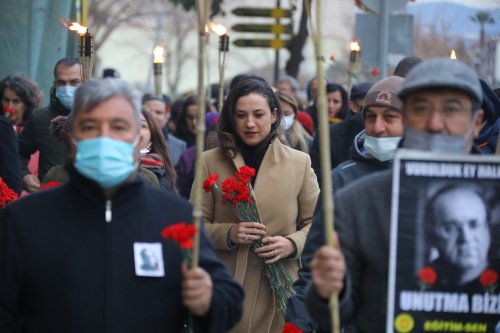 Atatürk Anıtı önünde Uğur Mumcu Anma etkinliği için toplanan katılımcılar meşalelerle çarşı içerisinden Uğur Mumcu Sevgi Yolu’na kadar yürüdüler. Burada Özgürlük ve Bağımsızlık Anıtı’na karanfil bırakan katılımcılar daha sonra anma programının devamı için Ahmet Ferahlı Parkı’na geçtiler.