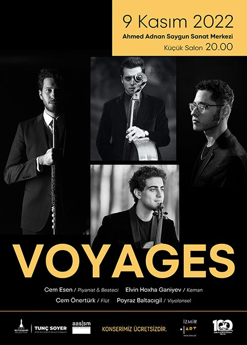 Elvin Hoxha Ganiyev (Keman), Poyraz Baltacıgil (Viyolonsel), Prof. Cem Önertürk (Flüt) ve Cem Esen'den (Piyano) oluşan Voyages Gurubu konserde Cem Esen'in bestelerini seslendirecek. Konser ücretsiz olarak AASSM küçük salonda gerçekleştirilecek.