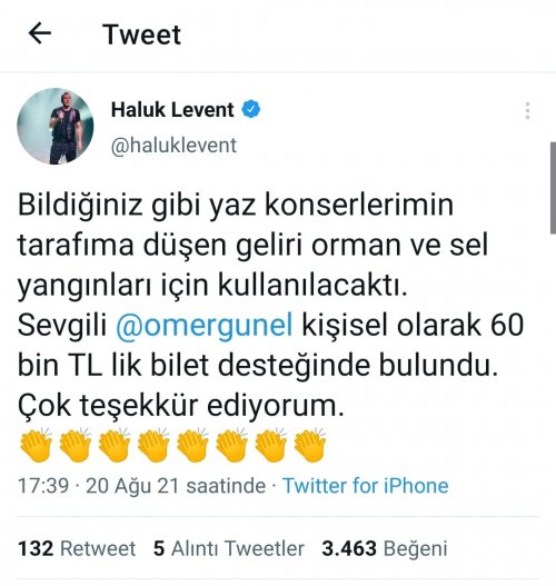 Ünlü müzisyen Haluk Levent ise Twitter hesabından yaptığı bir açıklamayla Kuşadası Belediye Başkanı Ömer Günel’e teşekkür etti. Haluk Levent açıklamasında şu ifadeleri kullandı “Bildiğiniz gibi yaz konserlerimin tarafıma düşen geliri orman ve sel yangınları için kullanılacaktı. Sevgili Ömer Günel kişisel olarak 60 bin TL lik bilet desteğinde bulundu. Çok teşekkür ediyorum.”