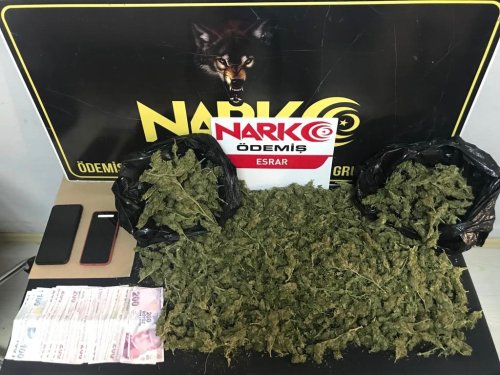 Ödemiş Narkotik Grup Amirliği ekipleri, uyuşturucu madde ticaretini engellemeye yönelik çalışmalar çerçevesinde, bir otomobilin İzmir'e yüklü miktarda uyuşturucu getireceği bilgisini edindi. Plakası önceden belirlenen otomobil Beydağ Ödemiş yolunda durduruldu. Araç içerisinde yapılan aramada 1 kilogram esrar maddesi ve uyuşturucu satışından elde edildiği değerlendirilen 8 bin 500 Türk Lirası para ele geçirildi.