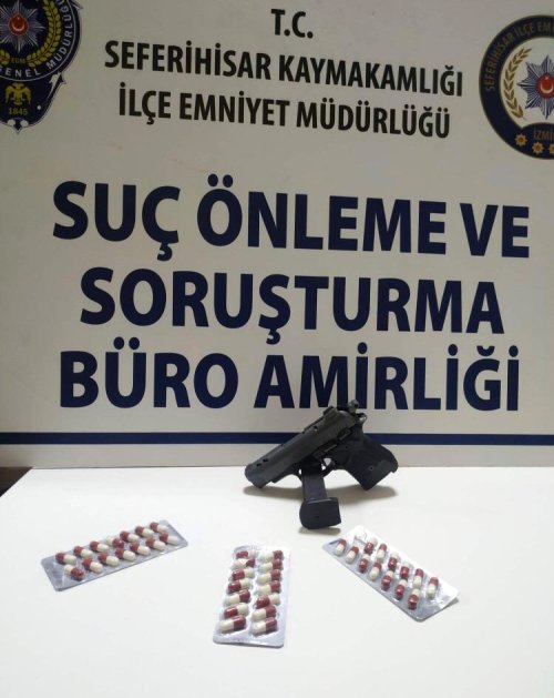 Seferihisar Suç Önleme ve Soruşturma Büro Amirliği ekipleri, Seferihisar ilçesinde E.T. (23) isimli şüphelinin uyuşturucu hap kullandığı bilgisi üzerine harekete geçti. 5 farklı adrese gerçekleştirilen operasyonda, 41 adet hap ve 1 adet kuru sıkı tabanca ele geçirildi.