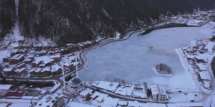 Beyaz görüntüsüyle seyrine doyumsuz manzaralar oluşturan Uzungöl, havadan görüntülendi.