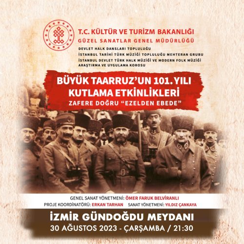 Zafer Bayramı kapsamında, Kültür ve Turizm Bakanlığı Güzel Sanatlar Genel Müdürlüğü tarafından Gündoğdu Meydanı’nda 21.30’da Zafere Doğru Ezelden Ebede gösterisi, Devlet Halk Dansları Topluluğu İstanbul Tarihi Türk Müziği Topluluğu Mehteran Grubu’nun gösterisi, İstanbul Devlet Türk Halk Müziği ve Modern Folk Müziği Araştırma ve Uygulama Korosu’nun konseri İzmirlilerin bayram coşkusunu taçlandıracak.