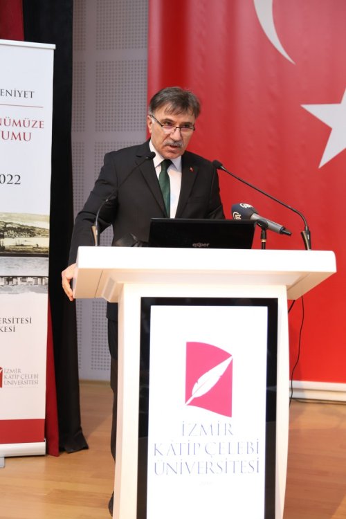 Sempozyum düzenleme kurulu adına konuşan Rektör Yardımcısı Prof. Dr. Turan Gökçe, 15 Mayıs 1919’da işgal edilen İzmir’in 9 Eylül 1922’de kazandığı istiklâlinin 100’ncü yılı vesilesiyle düzenledikleri üç gün sürecek sempozyumun değerli bilgilerin paylaşılacağı bir bilim şöleni olacağını kaydetti. İKÇÜ’nün kurulduğu günden bugüne toplumun “şehir, kültür, medeniyet” perspektifinden “tarih” bilincini canlı tutmak için üzerine düşeni yapmaya gayret gösterdiğini vurgulayan Prof. Dr. Gökçe, “Açılışını yapmak üzere bizleri onurlandırdığınız sempozyum da bu gayretin ortaya koyduğu sonuçlardan biridir. 705 yıl boyunca İzmir, bünyesinde barındırdığı farklılıkları zenginlik sayan, onları bir arada tutan hoşgörü ortamını ideal ölçülerde yaşatan gerçek anlamda bir şehir oldu. Bu hasletlere sahip olan Güzel İzmir, aynı zamanda 19 ve 20. yüzyıllarda asırlardır yaşadıkları topraklardan koparılarak sığınabilecekleri güvenli bir liman arayan muhacirlere kucak açan vefakâr ve fedakâr bir yerleşim oldu. Anadolu’nun Akdeniz’e açılan penceresi konumunda bulunan İzmir, 17. yüzyıldan itibaren yoğunlaşan iktisadi ve ticari faaliyetlerle elde edilen zenginlikle aynı zamanda edebiyat, kültür ve sanat faaliyetlerinin yoğunlaştığı bir merkez oldu. Bunda, daha 15. yüzyıldan itibaren kendisini besleyen Tire, Birgi, Ayasuluğ ve Bergama gibi merkezlerden yayılan bilim, kültür, sanat faaliyetlerinin büyük etkisi oldu” dedi.