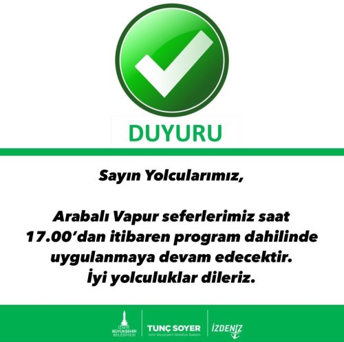 İzmir deniz ulaşımı sağlayıcısı İZDENİZ tarafından yapılan açıklamada arabalı vapur seferlerinin saat 17.00 itibarıyla yeniden başlayacağı duyuruldu.