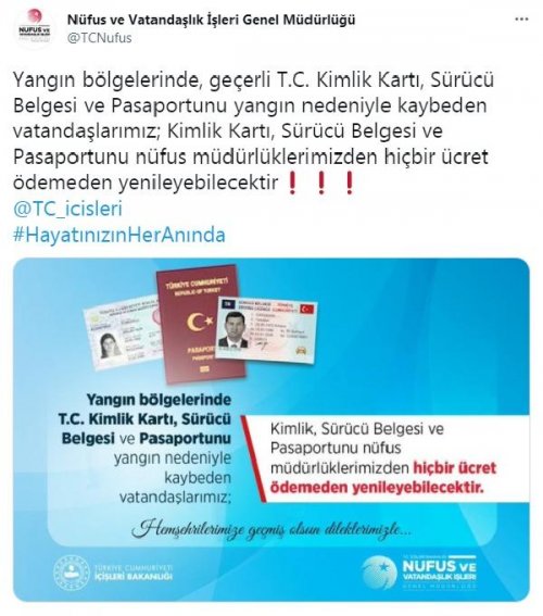 Nüfus ve Vatandaşlık İşleri Genel Müdürlüğü'nün Twitter hesabından yapılan açıklamada "Yangın bölgelerinde geçerli T.C. Kimlik Kartı, Sürücü Belgesi ve Pasaportunu yangın nedeniyle kaybeden vatandaşlarımız; Kimlik Kartı, Sürücü Belgesi ve Pasaportunu nüfus müdürlüklerimizden hiçbir ücret ödemeden yenileyebilecektir" denildi.