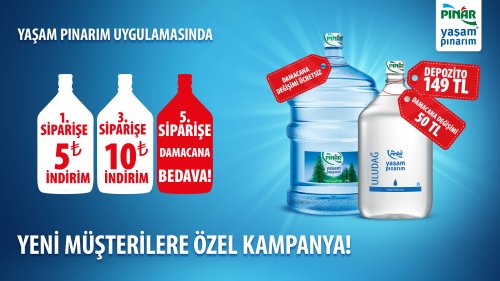 Yaşam Pınarım, yeni üyelerine ilk damacana siparişinde 5 TL, üçüncü damacana siparişinde 10 TL indirim fırsatı sunarken, beşinci damacana su siparişlerinde ücret almıyor.