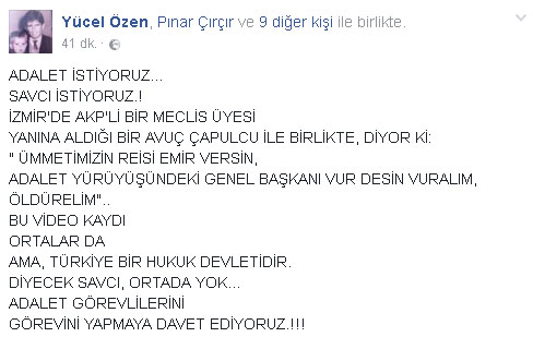 Cumhuriyet Halk Partisi (CHP) İzmir İl Eğitim Sekreteri Yücel Özen, Karabağlar Belediyesi Meclis Üyesi Emrullah Kavuz tarafından paylaşılan videoya tepki gösterdi. Özen isim vermeden sosyal medya üzerinden gösterdiği tepkiyle savcı ve hakimleri göreve çağırdı.